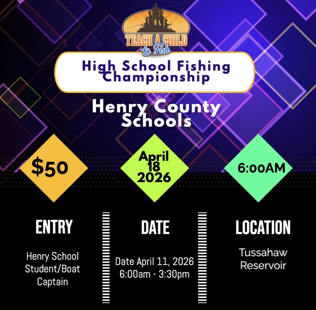 Get your high school student from Henry County involved and allow them to fish to become the Henry County TACTF High School Fishing Champion. Click the info tab below for more information on registering for the championship/mobile fishing pond/prizes, and so much more. The Championship will be at Tussahaw Reservoir on April 18, 2026.